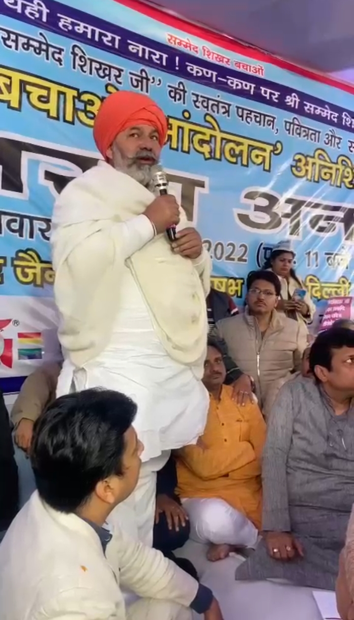 आखिरकार जैन समाज के समर्थन में वह चल रहे अनशन में पहुंचे भारतीय किसान यूनियन के राष्ट्रीय प्रवक्ता राकेश टिकैत जी उन्होंने चेतावनी देते हुए सरकार को यह दिखा दिया की जैसे किसानों को बेवकूफ बनाकर धरने से उठा दिया था लेकिन सममेद शिखर जी को यदि पर्यटन स्थल बनाया तो इसके परिणाम केंद्र सरकार को अभी से भुगतने होंगे उन्होंने जैन समाज की सभा को संबोधित करते हुए यह कहा कि मोदी सरकार जानबूझकर ऐसे कार्य करती है जिससे आने वाले चुनाव या या फिर कार्यकारिणी का चुनाव हो तो तब चाहे वह किसान मुद्दा हो चाहे जैन समाज का मुद्दा हो यदि देखा जाए तो भाजपा कहती है कि हमने सदा भारतीय जनता पार्टी को सहयोग देकर उसे शिखर पर पहुंचाया लेकिन दुर्भाग्य की बात यह है कि शिखर पर तो बैठा दिया लेकिन आज वही व्यक्ति जैन समाज के सबसे बड़े तीर्थ स्थल श्री सांवर शिखरजी के विरोध पर तुले उन्होंने कहा कि क्या कभी देवस्थल को पर्यटन स्थल बनाना चाहिए उन्होंने साफ-साफ चेताया कि यदि सरकार ने अपना फैसला वापस ना लिया तो भारतीय किसान यूनियन जैन समाज के साथ कंधे से कंधा मिलाकर खड़ी है और इसके लिए हमें अपनी जान भी देनी पड़े तो भी पीछे नहीं हटेंगे अभी मोदी सरकार ने देखा ही क्या है जिस दिन सर्व समाज एक होकर घरों से निकल पड़ेगा उस दिन भाजपा सरकार तो क्या झारखंड सरकार भी को भी उखाड़ फेंक दिया जाएगा उन्होंने कहा कि कांग्रेस हो या भाजपा यह सभी एक ही थाली के चक्के बसते हैं चट्टी भट्टे हैं इनकी बात पर कभी विश्वास नहीं किया जा सकता जब तक वह कार्य पूर्ण हो जाए उन्होंने जैन समाज का शुक्रिया अदा किया और कहा कि वह श्री सांवरिया शिखर जी को पर्यटन स्थल नहीं बनने देंगे यदि ऐसा हुआ तो सरकार से दो-दो हाथ करने में भी हम लोग पीछे नहीं हैं।