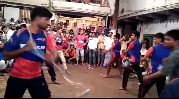 वाराणसी बजरडीहा में एक दुर्लभ कला का प्रदर्शन करते हुए एक से बढ़कर एक कलां का प्रर्दशन करते हुए वाराणसी खेल के खिलाड़ी जनाब इकबाल अहमद खलिफा के खिलाड़ीयों ने बेहतरीन तरीके से कलां को दिखाते हुए इस खेल में देखें एक हाथ में सटका और दूसरे हाथ में बनैठी लिए हूंए खिलाड़ी अद्भुत तरीके से प्रर्दशन किया ये एक ऐसा खेल है जिसमें एक खिलाड़ी कई तरह के खेल को खेलता है आप देख सकते हैं एक साथ 8 खिलाड़ी कितने बेहतरीन तरीके से प्रर्दशन कर रहे हैं