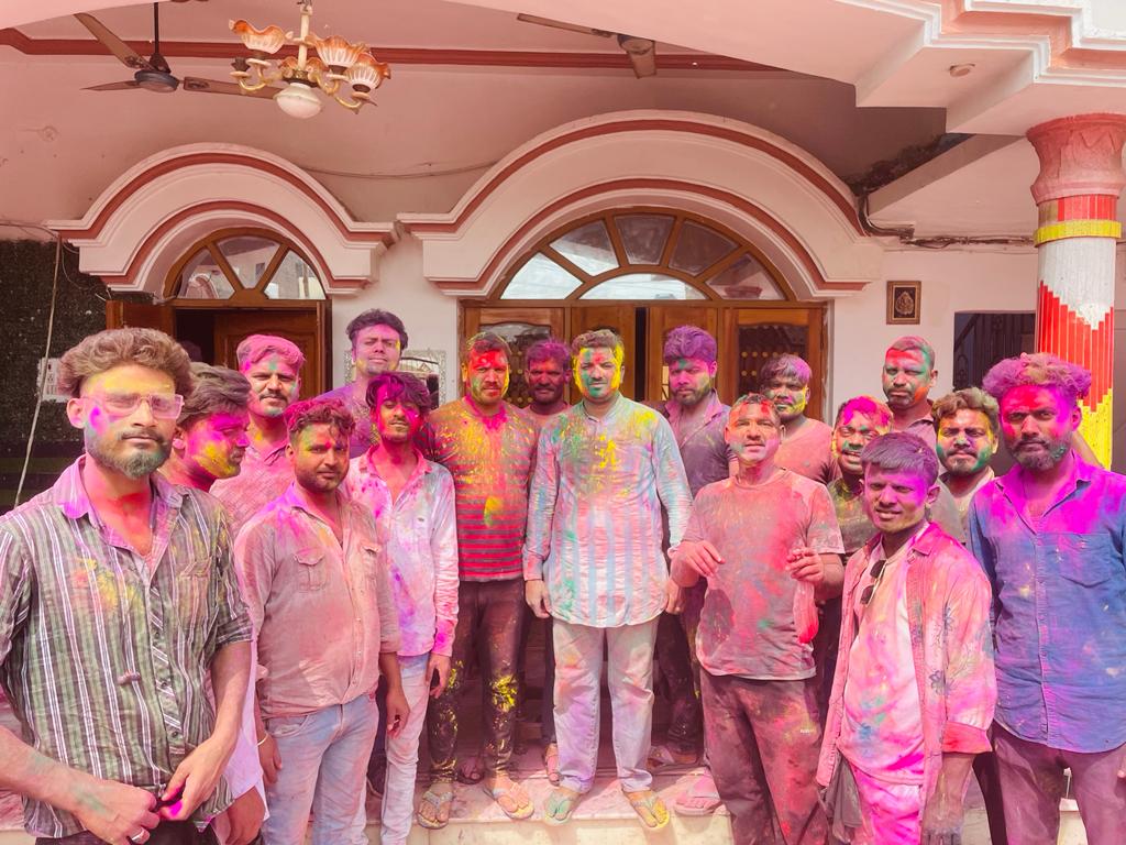 एक दूसरे के ऊपर अबीर गुलाल और रंग लगाकर गले से मिलकर एक दूसरे को बधाई देते रहे