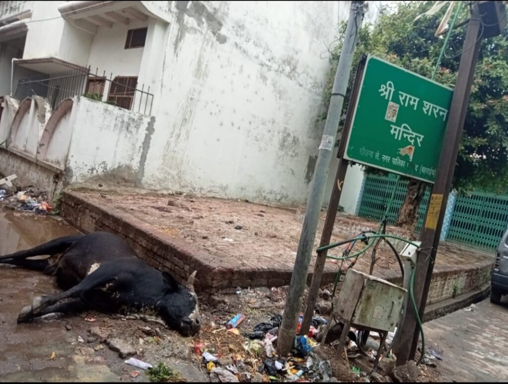 श्री राम शरण मंदिर के सामने बिजली के खम्भे में उतरे करेन्ट की चपेट में आकर तड़प तड़प कर मारा सॉड