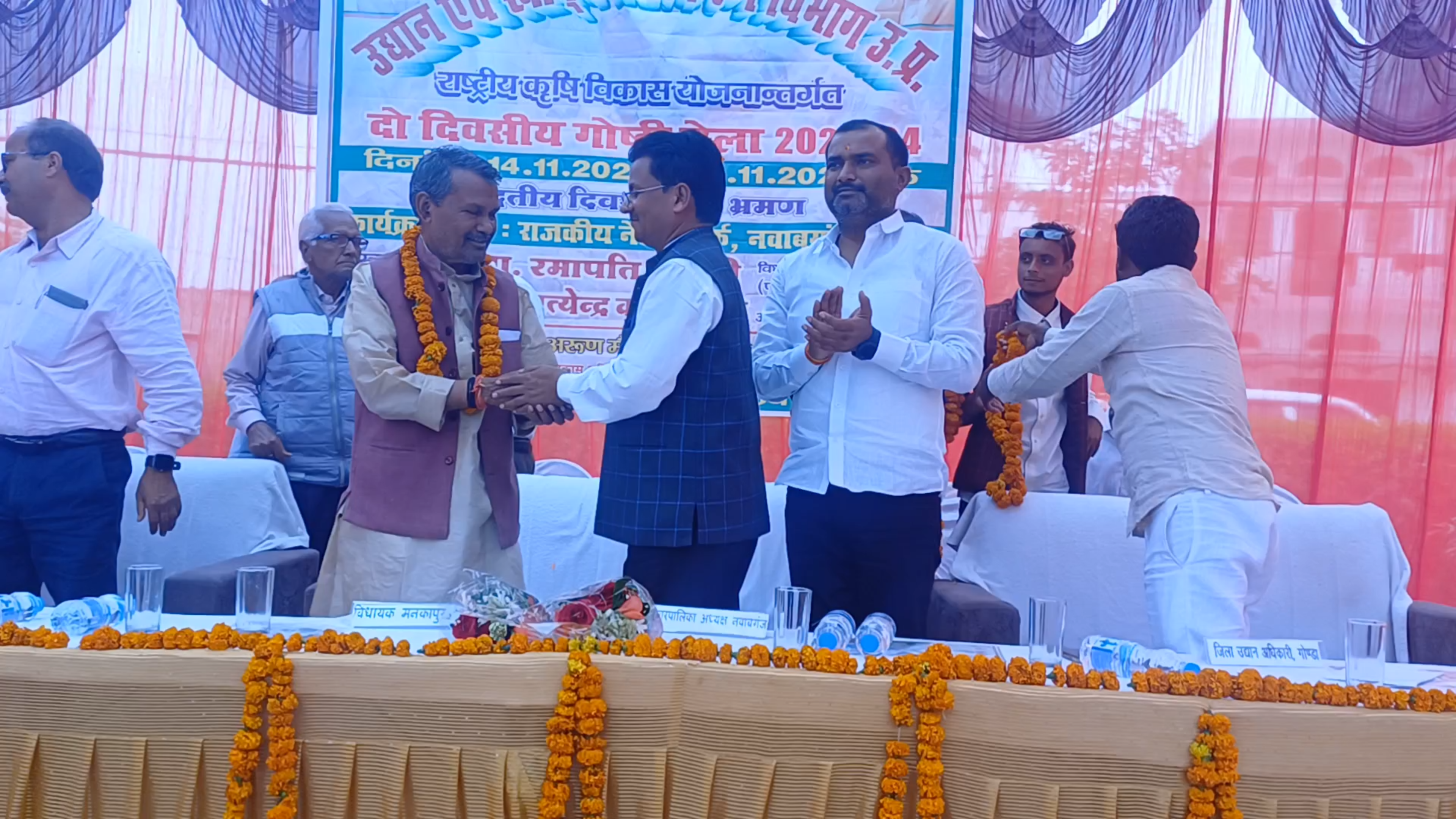 उत्तर प्रदेश के अंतर्गत जनपद गोंडा से आ रही है जहां पर राष्ट्रीय कृषि विकास योजना अंतर्गत दो दिवसीय 14 नवंबर से लेकर 15 नवंबर तक किसान गोष्ठी का आयोजन राजकीय नेहरु पार्क नवाबगंज में आयोजित किया गया जिस कार्यक्रम के मुख्य अतिथि माननीय विधायक मनकापुर श्री रमापति शास्त्री जी थे और विशिष्ट अतिथि नगर पालिका अध्यक्ष नवाबगंज श्री सत्येंद्र सिंह जी थे जिन्होंने फीता काटकर एवं दीप प्रज्वलित कर कार्यक्रम का शुभारंभ किया तथा विभिन्न स्टालों का निरीक्षण भी किया यहां तक जिला उद्यान अधिकारी श्री पारस नाथ जी के द्वारा माननीय विधायक जी को पुष्प कुछ देखकर स्वागत किया गया तथा गोष्ठी में विभिन्न वैज्ञानिकों ने नई तकनीकी हेतु प्रचार प्रसार किया गया तथा मनकापुर कृषि विज्ञान केंद्र के वैज्ञानिक डॉक्टर अजीत सिंह वत्स डॉक्टर मिथिलेश पांडे डॉक्टर अजय मिश्रा प्राचार्य लखन लाल शरण सिंह जी थे जिन्होंने कम लागत में ज्यादा उत्पादन बढ़ाने की जानकारी दी तथा माननीय विधायक जी के द्वारा किसानों से मोटे अनाज की आवश्यकता होने की बात कही तथा किसानों को पूरा सहयोग करने की बात करें का आश्वासन दिया इसी क्रम में अध्यक्ष श्री सत्येंद्र सिंह जी के द्वारा उद्यान विभाग से संचालित योजनाओं का लाभ लेने हेतु किसानो को आगे आने की बात की और उनका उत्साह वर्धन किया तथा एससी क्रम में माननीय विधायक जी के द्वारा 10 किसानों को सम्मानित भी किया गया अंत में उद्यान अधिकारी गोंडा श्री पारसनाथ जी के द्वारा मुख्य अतिथियों और किसानों को धन्यवाद दिया गया देखिए क्राइम खुलासा न्यूज के साथ जितेंद्र तिवारी की रिपोर्ट