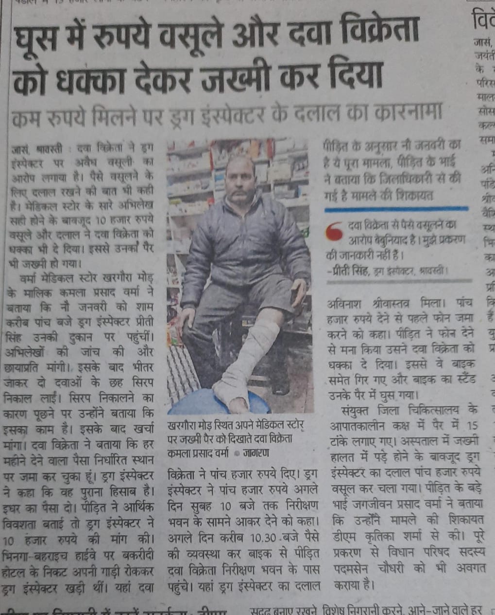 खबर उत्तर प्रदेश के अंतर्गत जनपद श्रावस्ती से है जहां पर नियुक्त ड्रग इंस्पेक्टर प्रीति सिंह नहीं आ रही अपनी आदतों से बाज फिर भी ड्रग इंस्पेक्टर प्रीती सिंह पर जनपद के आला अधिकारी बने मेहरवान ड्रग इंस्पेक्टर प्रीति सिंह अपने रिश्वतखोर करनामे की वजह से सदैव सुर्ख़ियों में बनी रहती हैं ताजा मामला जनपद श्रावस्ती के खरगोड़ा मोड का है जहां पर रिश्वत में कम रुपए मिलने की वजह से दवा विक्रेता को धक्का देकर किया गया जख्मी इतना ही नहीं ड्रग इंस्पेक्टर प्रीति सिंह कही पर एक-एक नाम से दो-दो मेडिकल स्टोर चलवा रही हैं तो कहीं पर दोषी पाए जाने के बाद भी कार्यवाही करवाने में आनाकानी करती हैं तो कहीं पैसे की लालच दवा ब्वसाइयो को फर्जी नोटिस थमाती है इतना ही नही ड्रग स्टार प्रीति सिंह अपनी आदतो की वजह से ललितपुर में बिजलैंस टीम के हाथों गिरफ्तार करके जेल भेजी जा चुकी हैं फिर भी फिर भी उनकी आदतों में नहीं हुआ सुधार आखिर कब की जाएगी ड्रग इंस्पेक्टर प्रीती सिंह पर कार्यवाही