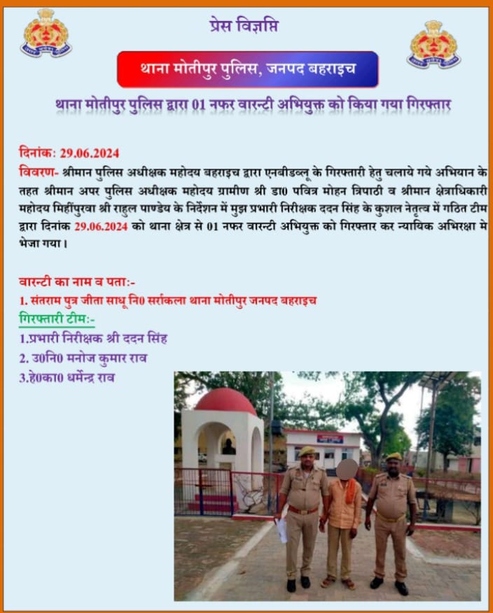 *विवरण-* श्रीमान पुलिस अधीक्षक महोदय बहराइच द्वारा एनबीडव्लू के गिरफ्तारी हेतु चलाये गये अभियान के तहत श्रीमान अपर पुलिस अधीक्षक महोदय ग्रामीण श्री डा0 पवित्र मोहन त्रिपाठी व श्रीमान क्षेत्राधिकारी महोदय मिहींपुरवा श्री राहुल पाण्डेय के निर्देशन में मुझ प्रभारी निरीक्षक ददन सिंह के कुशल नेतृत्व में गठित टीम द्वारा दिनांक 29.06.2024 को थाना क्षेत्र से 01 नफर वारन्टी अभियुक्त को गिरफ्तार कर न्यायिक अभिरक्षा मे भेजा गया ।