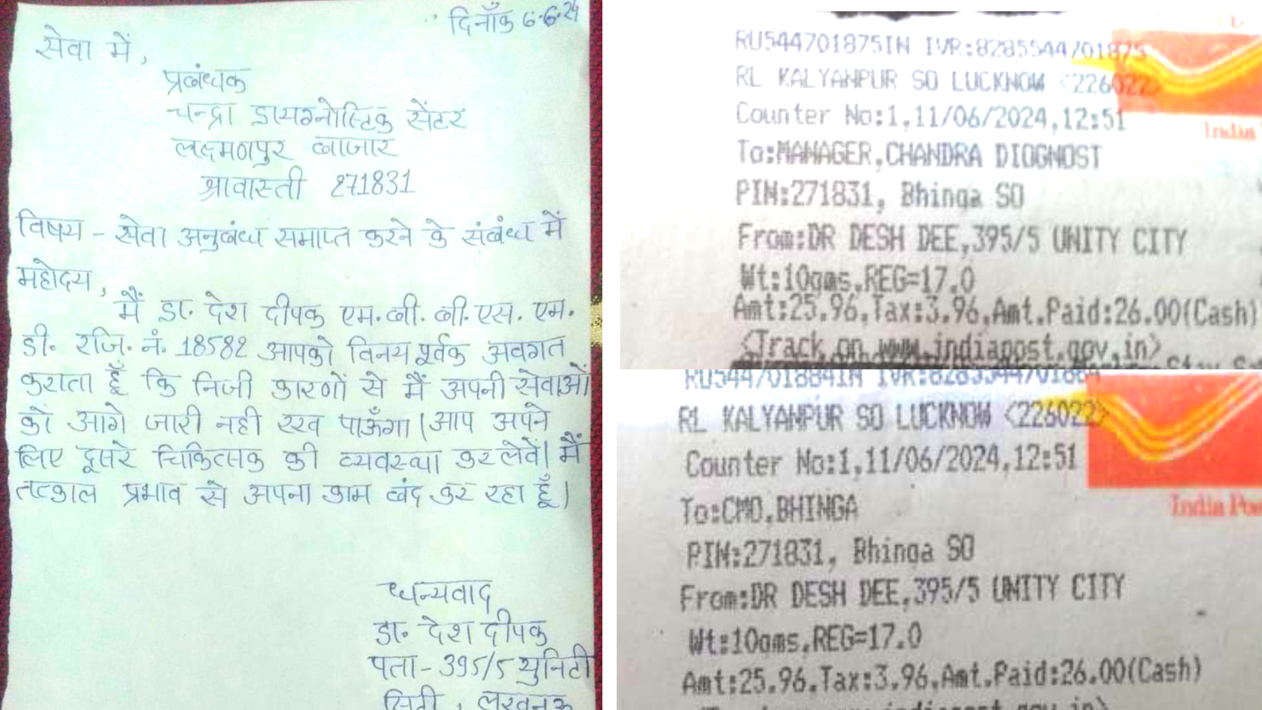 जनपद श्रावस्ती अन्तर्गत लक्ष्मनपुर बाजार में बगैर किसी डाक्टर के डिग्री के ही वर्तमान में चल रहा चन्द्रा डायग्नोस्टिक सेंटर बिस्तार से बताते चलें कि चन्द्रा डायग्नोस्टिक सेंटर के संचालन हेतु डाक्टर देश दीपक एम.बी.बी.एस.रजिस्ट्रेशन नम्बर 18582 ने अपनी डिग्री प्रस्तुत की थी लेकिन उन्होंने अपनी व्यक्तिगत कारणों से 6 जून 2024 को रजिस्टर्ड डाक से चन्द्रा डायग्नोस्टिक सेंटर के प्रबंधक सहित मुख्य चिकित्सा अधिकारी श्रावस्ती को पत्र भेजकर उक्त सेन्टर पर समय दे पाने में अपनी असमर्थता ब्यक्त करते हुए दूसरे चिकित्सक की व्यवस्था करने की बात कही अबतक न तो चन्द्रा डायग्नोस्टिक सेंटर के प्रबंधक द्वारा किसी डाक्टर के अभाव में सेंटर बंद किया गया और न ही मुख्य चिकित्सा अधिकारी श्रावस्ती द्वारा सेंटर बंद करवाया गया जो सेंटर स्वास्थ्य बिभाग के अधिकारियो के ऊपर एक बड़ा सवाल खड़ा कर रहा है कि मुख्य चिकित्सा अधिकारी श्रावस्ती के संग्यान में होने के बाद भी आखिर डाक्टर के अभाव में क्यो नही बंद हो रहा चन्द्रा डायग्नोस्टिक सेंटर।