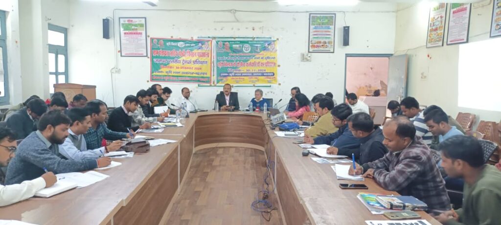 उप कृषि निदेशक श्री टी०पी० शाही ने बताया गया कि आज दिनांक 30 नवम्बर 2024 को शासन के निर्देश के क्रम में जनपद की 136 न्याय पंचायतों की 976 ग्राम पंचायतों में ग्राम पंचायत स्तरीय गोष्ठी/किसान पाठशाला का आयोजन कराये जाने के दृष्टिगत कृषि विभाग के क्षेत्रीय कर्मचारियों/अधिकारियों को प्रशिक्षित किया गया। कृषि भवन सभागार बहराइच में आयोजित किसान पाठशाला हेतु क्षेत्रीय कर्मचारियों के प्रशिक्षण को सम्बोधित करते हुये उप कृषि निदेशक श्री टी०पी० शाही ने उपस्थित कर्मचारियों को निर्देश दिया कि किसानों की आय बढ़ाने हेतु फसलोत्पादन की तकनीकी जानकारी कृषि विविधीकरण अपनाकर आय वृद्वि की जा सकती है। जनपद में 84 कृषक उत्पादक संगठनों का गठन कराया गया है। जो अच्छा कार्य कर रहे है। किसान पाठशाला गोष्ठी के आयोजन के दौरान इन एफ०पी०ओ० के सदस्यों को भी आमंत्रित किया जाय तथा उनका भी सम्बोधन कराया जाय। जनपद के कई किसान अच्छा कार्य कर रहे है। उन प्रगतिशील किसानों को पाठशाला गोष्ठी में आमंत्रित कर उनकी भी सफलता की कहानी प्रस्तुत करायी जाय। किसान पाठशाला आयोजित कराने का मुख्य उद्देश्य किसानों को कृषि एवं ऐलाइड विभागों द्वारा संचालित योजनाओं की जानकारी प्रदान कर तथा उन्हें प्रशिक्षित कर आय वृद्धि करना है। उप निदेशक, कृषि ने कर्मचारियों से कहा कि आप सभी ग्राम पंचायतों में पाठशाला लगाने जा रहें। उन ग्रामों के राजस्व लेखपाल एवं ग्राम प्रधान के माध्यम से अधिक से अधिक फार्मर रजिस्ट्री करें तथा उन्हें बतायें कि जब तक आप फार्मर रजिस्ट्री नहीं कराते है, तब तक प्रधानमंत्री किसान सम्मान निधि योजना का लाभ नहीं मिलेगा। उन्होंने नैनो डीएपी एवं नैनो यूरिया के प्रयोग को बढ़ावा देने के उद्देश्य से अपने-अपने क्षेत्र के 02-02 किसानों के यहां प्रदर्शन करायें।