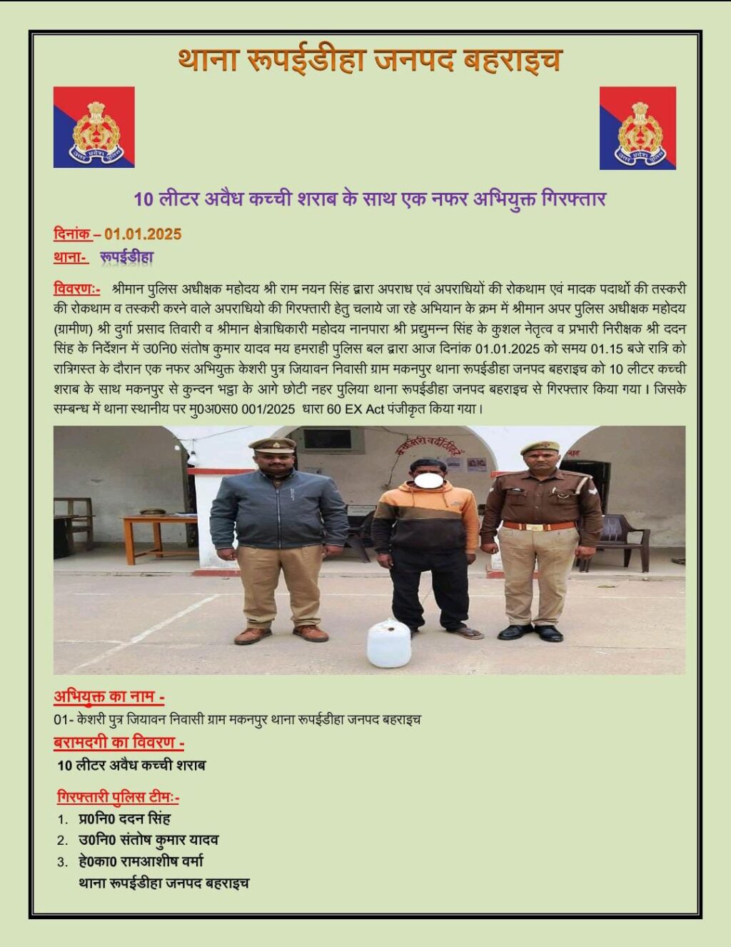 *विवरणः* श्रीमान पुलिस अधीक्षक महोदय बहराइच द्वारा अपराध एवं अपराधियों की रोकथाम एवं मादक पदार्थों की तस्करी की रोकथाम व तस्करी करने वाले अपराधियो की गिरफ्तारी हेतु चलाये जा रहे अभियान के क्रम में श्रीमान अपर पुलिस अधीक्षक महोदय (ग्रामीण) श्री दुर्गा प्रसाद तिवारी व श्रीमान क्षेत्राधिकारी महोदय नानपारा श्री प्रद्युमन्न सिंह के कुशल नेतृत्व व प्रभारी निरीक्षक श्री ददन सिंह के निर्देशन में उ(०नि० धनजी सिंह व उ०नि० रणविजय सिंह द्वारा आज दिनांक 01.01.2025 को सुबह समय 09.15 बजे एक नफर अभियुक्त हवलदार सोनकर पुत्र बिन्द्रा सोनकर निवासी ग्राम प्रहलाद गाँव दा० भगवानपुर करिंगा थाना रुपईडीहा जनपद बहराइच को 10 लीटर कच्ची शराब के साथ साई गाँव नहर पुल से बदलदास बाबा के कुटिया के तरफ थाना रूपईडीहा जनपद बहराइच से गिरप्तार किया गया। जिसके सम्बन्ध में थाना स्थानीय पर मु0अ0स0 001/2025 धारा 60 EX Act पंजीकृत किया गया।